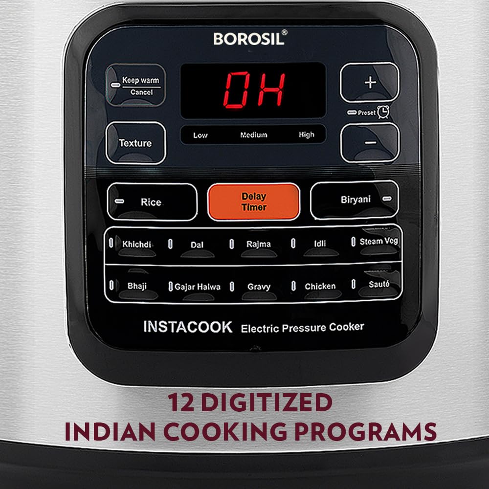 Borosil Instacook 6 L Electric Stainless Steel Pressure Cooker | 12 Digitized Indian Cooking Programs | 15 Hour Delay Timer | One Touch Instant Cooking | Idli Maker, Rice Cooker | 2 Year Warranty on motor