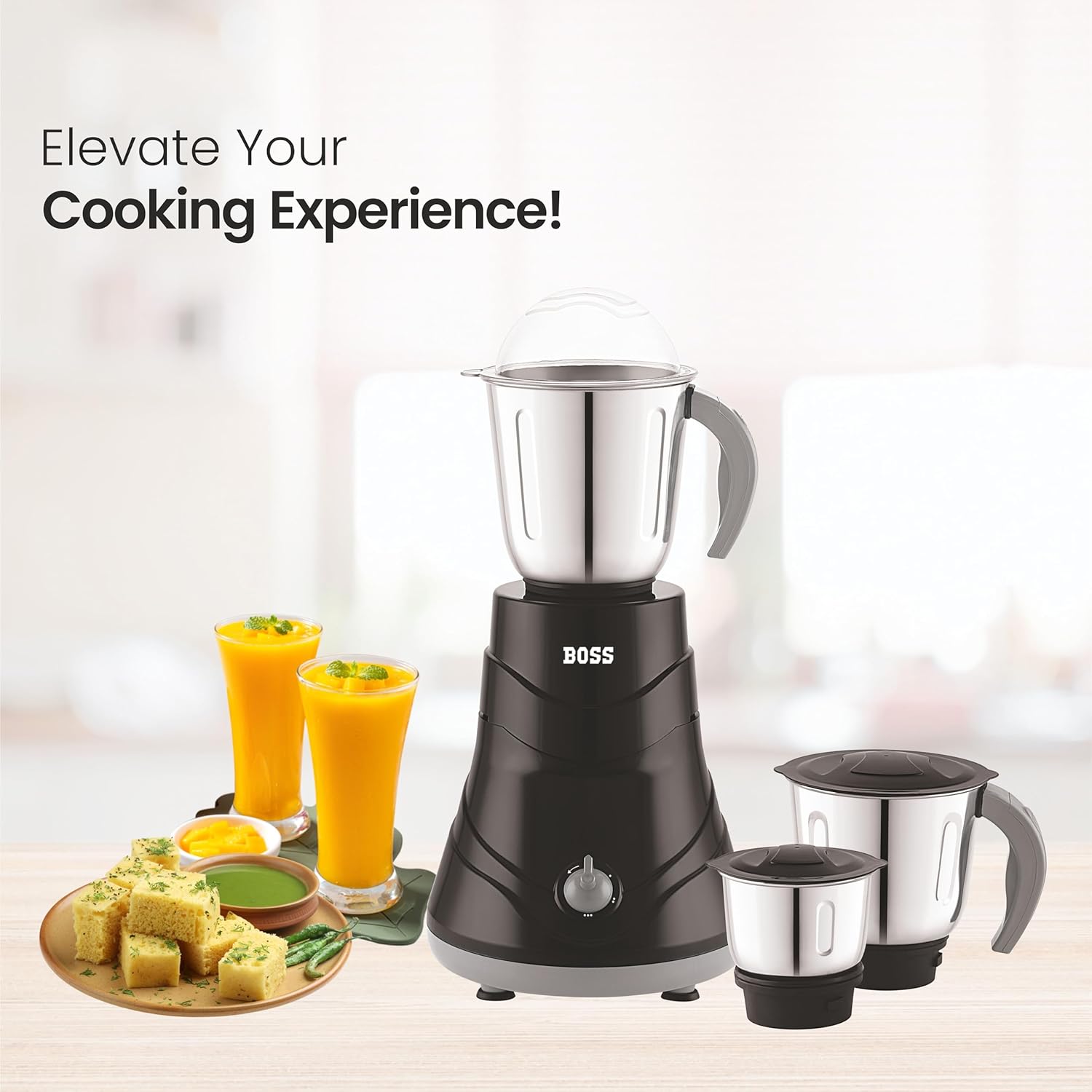BOSS Alpha 750W Mixer Grinder with Powerful Motor, 5 years warranty on motor & Overload Protection, 3 Stainless Steel Jars, Black and Grey